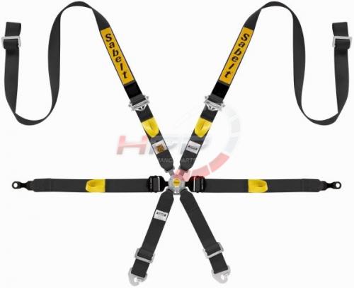 Profesionální závodní 6-bodový bezpečnostní pás Sabelt New Spec Saloon pro Porsche Enduro 997 GT3 911 s šířkou 51mm (2"). Ultralehké nastavovací prvky a přezky. Velké žluté poutka na ruce pro snadné nastavení. Ramenní popruhy se zapínáním na smyčku. Stahovací břišní pásy s uchycením specifickým pro Porsche. Upevnění pomocí karabiny zkracuje dobu pro zapínání. K použití výhradně se systémy FHR včetně H.A.N.S.