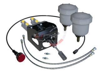 - Jednotka využívá systém dvojího brzdového válce, který je ovládán vyrovnávací propojkou, která zajišťuje rozložení brzdného účinku mezi předními a zadními brzdami.