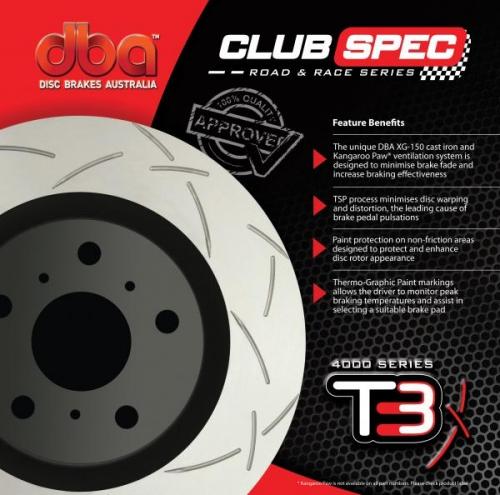 4000 Series Clubspec Road & Race T3 Slot Design - vrcholná řada sportovně-závodních kotoučů. Jsou určené pro uživatele, hledající výkonné kotouče pro běžný provoz a občasnou jízdu na okruzích. Tato řada kotoučů se vyznačuje patentovaným chlazením "Kangaroo paw", tri-symetrickými T3 drážky snižující vibrace a hluk, což má za následek daleko tišší, vnímavější a hladší odezvu od brzdového pedálu než je tomu u kotoučů T2. Design T3 drážek poskytuje rovnoměrné opotřebení destiček a minimalizuje pravděpodobnost vytvrdnutí povrchu destičky. Kotouče jsou vyrobené z XG150 High Carbon legované oceli, která zvyšuje jejich tepelnou odolnost, což zaručuje delší funkčnost při vysokém zatížení. Jsou charakteristické tepelnou stabilitou profilování (TSP) prodlužující životnost kotouče a barevným termo značením pro kontrolu maximálního ohřátí za jízdy. Kotouče jsou také opatřeny černým nátěrem pro prodloužení životnosti.