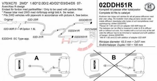 Catback výfuk Simons Volvo V70 / XC70 2WD 1.6/2.0 T4/T5 / 2.5FT (07-). Kompletní výfukový systém od katalyzátoru. Pasuje pouze na modely s filtrem částic. Pasuje pouze na FWD modely s typem vedení A vyobrazeném na fotce.
