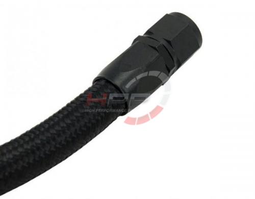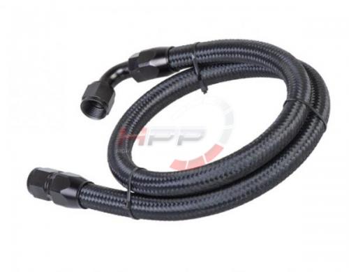 Nylonová opletená hadice na olej se šroubovanými hlinkovými koncovkami - cutter systém (1x rovný, 1x koleno 90° ostrý úhel).