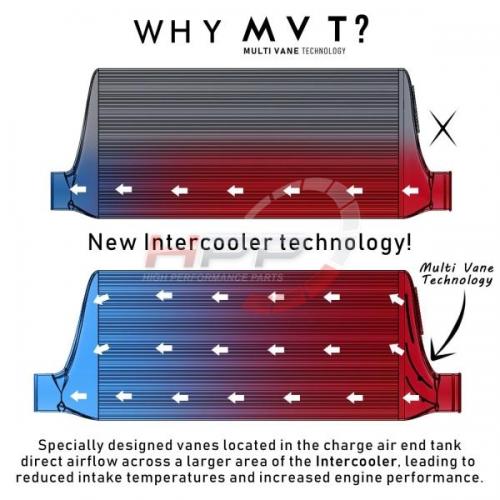 - Technologie MVT navržená společností Direnza nabízí vyšší účinnost mezichladiče ve srovnání s jinými alternativami na trhu s náhradními díly. Toho je dosaženo použitím pečlivě umístěných lopatek v koncové nádrži, které rovnoměrně distribuují vzduch přes celé jádro. Využitím celé plochy jádra mezichladiče je optimalizováno chlazení nasátého vzduchu, což vede k většímu výkonu.