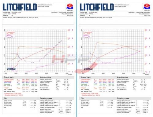 Forge intercooler v kombinaci s výfukovým systémem typu catback zaručuje bezkonkurenční výkon. Výsledky konečných zkoušek byly velmi pozoruhodné - intercooler Forge Motorsport zmenšil IAT na polovinu a výrazně zvýšil jak výkon, tak točivý moment oproti továrním údajům společnosti Hyundai (275PS/278Nm), na úctyhodných 307PS a 470Nm.