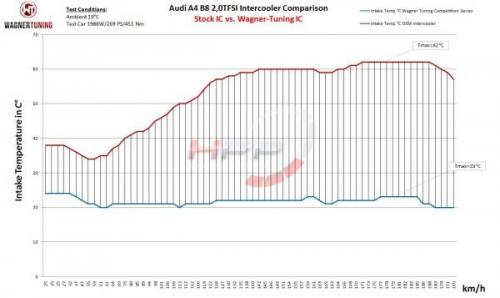 Vysoce výkonný intercooler německého výrobce Wagner Tuning disponuje jádrem o rozměru 610 x 440 x 65mm a nabízí o 178% větší chladící plochu a o 158% větší objem vzduchu (17,4 litrů) v porovnání s originálním chladičem. Nově navržené závodní jádro zajišťuje velmi dobrý průtok vzduchu a je také velmi lehké. Bočnice jsou vyrobeny z litého hliníku a zajišťují optimální průtok a vysokou účinnost chlazení, která byla simulovaná a analyzována v CAD programech k docílení nejlepších výsledků. Výsledkem jsou výborné chladící vlastnosti s minimálním zpětným tlakem. Tento mezichladič je tou nejlepší volbou, pokud jde o nárůst výkonu a snížení teploty nasávaného vzduchu. IC disponuje antikorozním ochranným nátěrem s dokonalou charakteristikou rozptýlení tepla. Snadná instalace Plug & Play pouhou výměnou za původní mezichladič. Wagner Tuning intercooler zaručuje optimální chlazení stlačeného vzduchu s jasným zvýšením výkonu! Všechny výrobky procházejí přísnou kontrolu kvality.