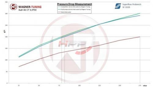 Vysoce výkonný intercooler německého výrobce Wagner Tuning disponuje jádrem o rozměru 610 x 440 x 65mm a nabízí o 178% větší chladící plochu a o 158% větší objem vzduchu (17,4 litrů) v porovnání s originálním chladičem. Nově navržené závodní jádro zajišťuje velmi dobrý průtok vzduchu a je také velmi lehké. Bočnice jsou vyrobeny z litého hliníku a zajišťují optimální průtok a vysokou účinnost chlazení, která byla simulovaná a analyzována v CAD programech k docílení nejlepších výsledků. Výsledkem jsou výborné chladící vlastnosti s minimálním zpětným tlakem. Tento mezichladič je tou nejlepší volbou, pokud jde o nárůst výkonu a snížení teploty nasávaného vzduchu. IC disponuje antikorozním ochranným nátěrem s dokonalou charakteristikou rozptýlení tepla. Snadná instalace Plug & Play pouhou výměnou za původní mezichladič. Wagner Tuning intercooler zaručuje optimální chlazení stlačeného vzduchu s jasným zvýšením výkonu! Všechny výrobky procházejí přísnou kontrolu kvality.