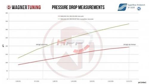 Vysoce výkonný intercooler německého výrobce Wagner Tuning disponuje jádrem o rozměru 520 x 210 x 150mm a nabízí o 85% větší chladící plochu a o 90% větší objem vzduchu v porovnání s originálními chladiči. Nově navržené závodní jádro "tube and fin" zajišťuje velmi dobrý průtok vzduchu a je také velmi lehké. Bočnice jsou vyrobeny z litého hliníku a zajišťují optimální průtok a vysokou účinnost chlazení, která byla simulovaná a analyzována v CAD programech k docílení nejlepších výsledků. Výsledkem jsou výborné chladící vlastnosti s minimálním zpětným tlakem. Tento mezichladič je tou nejlepší volbou, pokud jde o nárůst výkonu a snížení teploty nasávaného vzduchu. IC disponuje antikorozním ochranným nátěrem s dokonalou charakteristikou rozptýlení tepla. Snadná instalace Plug & Play pouhou výměnou za původní mezichladiče. Wagner Tuning intercooler zaručuje optimální chlazení stlačeného vzduchu s jasným zvýšením výkonu! Všechny výrobky procházejí přísnou kontrolu kvality.