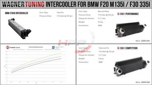 Vysoce výkonný intercooler německého výrobce Wagner Tuning disponuje jádrem o rozměru 520 x 210 x 130mm a nabízí o 85% větší chladící plochu a o 60% větší objem vzduchu v porovnání s originálním chladičem. Nově navržené závodní jádro "tube and fin" zajišťuje velmi dobrý průtok vzduchu a je také velmi lehké. Váha celého intercooleru je 8,8kg. Bočnice jsou vyrobeny z litého hliníku a zajišťují optimální průtok a vysokou účinnost chlazení, která byla simulovaná a analyzována v CAD programech k docílení nejlepších výsledků. Výsledkem jsou výborné chladící vlastnosti s minimálním zpětným tlakem. Tento mezichladič je tou nejlepší volbou, pokud jde o nárůst výkonu a snížení teploty nasávaného vzduchu. IC disponuje antikorozním ochranným nátěrem s dokonalou charakteristikou rozptýlení tepla. Snadná instalace Plug & Play pouhou výměnou za původní mezichladič. Wagner Tuning intercooler zaručuje optimální chlazení stlačeného vzduchu s jasným zvýšením výkonu! Všechny výrobky procházejí přísnou kontrolu kvality.