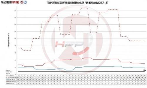Vysoce výkonný intercooler německého výrobce Wagner Tuning disponuje jádrem o rozměru 715 x 162 x 122mm a nabízí o 42% větší chladící plochu a o 144% větší objem vzduchu (12,7 litrů) v porovnání s originálním chladičem. Nově navržené "tube and fin" jádro zajišťuje velmi dobrý průtok vzduchu a je také velmi lehké. Bočnice jsou vyrobeny z litého hliníku a zajišťují optimální průtok a vysokou účinnost chlazení, která byla simulovaná a analyzována v CAD/FEM programech k docílení nejlepších výsledků. Výsledkem jsou výborné chladící vlastnosti s minimálním zpětným tlakem. Tento mezichladič je tou nejlepší volbou pro street racing i závodní účely a také pokud jde o nárůst výkonu a snížení teploty nasávaného vzduchu. IC disponuje antikorozním ochranným nátěrem s dokonalou charakteristikou rozptýlení tepla. Snadná instalace Plug & Play pouhou výměnou za původní mezichladič. Wagner Tuning intercooler zaručuje optimální chlazení stlačeného vzduchu s jasným zvýšením výkonu! Všechny výrobky procházejí přísnou kontrolu kvality.
