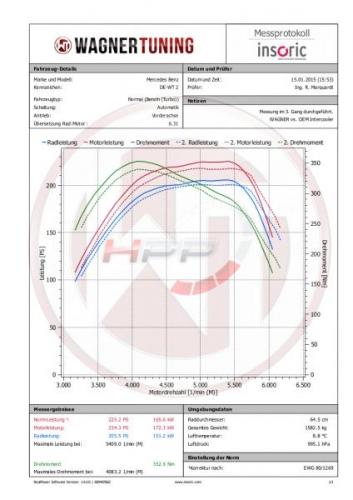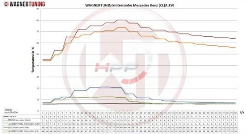 Vysoce výkonný intercooler německého výrobce Wagner Tuning disponuje jádrem o rozměru 640 x 200 x 110mm a nabízí o 25% větší chladící plochu a o 110% větší objem vzduchu (14,08 litrů) v porovnání s originálním chladičem. Nově navržené "tube and fin" jádro zajišťuje velmi dobrý průtok vzduchu a je také velmi lehké. Váha celého intercooleru je 10,5kg. Bočnice jsou vyrobeny z litého hliníku a zajišťují optimální průtok a vysokou účinnost chlazení, která byla simulovaná a analyzována v CAD programech k docílení nejlepších výsledků. Výsledkem jsou výborné chladící vlastnosti s minimálním zpětným tlakem. Tento mezichladič je tou nejlepší volbou, pokud jde o nárůst výkonu a snížení teploty nasávaného vzduchu. IC disponuje antikorozním ochranným nátěrem s dokonalou charakteristikou rozptýlení tepla. Snadná instalace Plug & Play pouhou výměnou za původní mezichladič. Wagner Tuning intercooler zaručuje optimální chlazení stlačeného vzduchu s jasným zvýšením výkonu! Všechny výrobky procházejí přísnou kontrolu kvality. Testován do 6 barů.