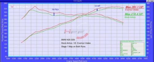 Eventuri kit sání pro morory BMW N20 je dalším z kompletních systémů vedení nasávaného vzduchu do motoru. Jedná se o kompletně uzavřený kit sání, který zajišťuje, že turbodmychadlo nenasává horký vzduch z motorového prostoru. K zajištění dostatečného přísunu čerstvého vzduchu, doplnilo Eventuri karbonový nasávač za masku chladiče, která sání plní vzduchem, když je vůz v pohybu. Výsledkem je snížení teploty nasávaného vzduchu oproti sériovému airboxu. Aby byl vzduch veden ideální cestou bez restrikcí a nežádoucích turbulencí v sání, používá i tento kit sání patentovaný venturi airbox s reverzně uloženým sportovním filtrem a speciálně pro tento model vyvinutou sací trubicí z karbonových vláken, která nahrazuje originální díl. Ten je vybaven komorou, která tlumí hluk sání, ale zároveň je zdrojem nežádoucího víření vzduchu. Instalací sportovního kitu sání Eventuri je zajištěn zcela hladký průchod nasávaného vzduchu.