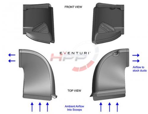 - lopatky byly navrženy pro maximální efektivitu a jsou snadno instalovatelné. Připojí se na stávající vzpěrovou výztuhu a pak jsou drženy v poloze u předních mříží. Lopatky Eventuri byly navrženy tak, aby seděly přímo za předními mřížemi a zachytily tak co nejvíce vzduchu. Detailnější tvar těchto lopatek si můžete prohlédnout na fotkách.