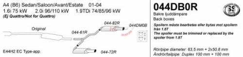 Koncové tlumiče výfuku Simons Audi A4 B6 FWD Sedan/Avant 1.6i/2.0i/1.9TDi/2.5TDi (01-05). Kompletní výfukový systém od středového tlumiče.