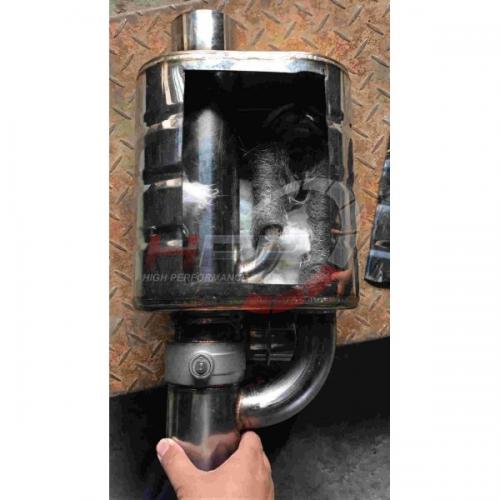 Univerzální koncový tlumič výfuku vyrobený kompletně z nerezové oceli T304 s integrovanou výfukovou klapkou. Klapka je ovládána elektronicky pomocí dálkového ovládání. Napájení je řešeno na 12V přes cigaretový zapalovač nebo zapojením přes spínací skříňku. Výfuk je určený pro jízdu s otevřenou klapkou, při zavření dochází k nárůstu protitlaku, musí být tedy brán zřetel na dávkování výkonu, což platí zejména u turbo motorů.