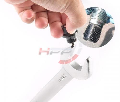 Magnetický výpustný šroub obsahuje magnet, který zachycuje abrazivní železitý materiál, jenž může cirkulovat uvnitř motoru běžným používáním a poškodit ho tak. Vyrobený z pevné slitiny hliníku. Eloxovaný pro maximální odolnost. Nekoroduje. Lze opakovaně použít. Mnohem lehčí než sériový ocelový šroub. Součástí balení je těsnící o-kroužek.