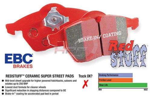 Brzdové destičky EBC Brakes řady Redstuff Ceramic jsou určené pro silniční použití jak pro sériové, tak lehce upravené vozy. Sportovní desky Redstuff snižují brzdnou dráhu oproti sériovým deskám. Jejich speciální směs neobsahuje agresivní černý brzdový prach, který se lepí na ráfky a ničí je. Posktyují perfektní stálý brzdný účinek do 750°C. Vyznačují se velmi dobrou životností i přes velký koeficient tření.