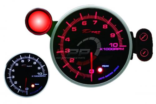 Budík otáčkoměr nejvyšší série Peak firmy Depo Racing. Budíky mají programovatelné varování (programmable warning) a také funkci vyvolávání (peak recall). Budíky jsou podsvícené bílou a červenou LED diodou. Lze tedy vybrat vhodnou kombinaci. Jsou výborně viditelné i při ostrém slunci. Montážní hloubka je 23mm. Balení obsahuje shift light, kabeláž, ovládací panel, držák na palubovku a montážní materiál.