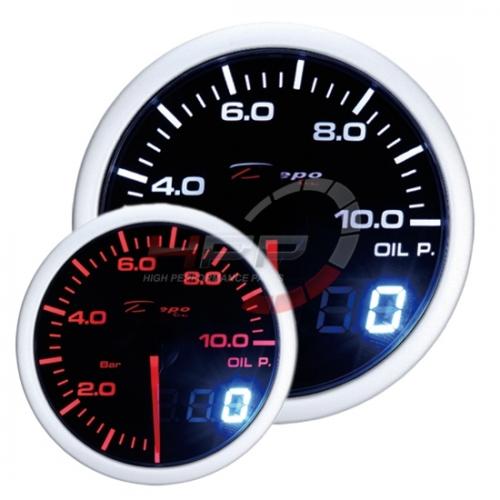 Budík série Dual View firmy Depo Racing. Budíky jsou podsvícené bílou a červenou LED diodou. Lze tedy vybrat požadovanou barvu. Zobrazují hodnoty jak analogově tak digitálně. Jsou výborně viditelné i při ostrém slunci. Montážní hloubka je 25mm. Balení obsahuje elektronický senzor tlaku, stínítko, držák na palubovku, kabeláž a montážní materiál.