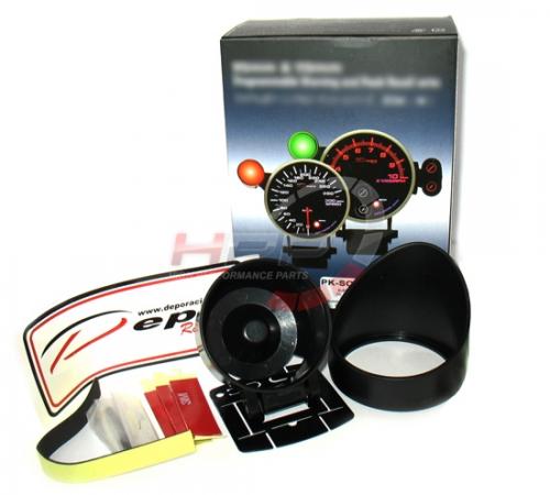 Budík série Dual View firmy Depo Racing. Budíky jsou podsvícené bílou a červenou LED diodou. Lze tedy vybrat požadovanou barvu. Zobrazují hodnoty jak analogově tak digitálně. Jsou výborně viditelné i při ostrém slunci. Montážní hloubka je 25mm. Balení obsahuje elektronický senzor tlaku, stínítko, držák na palubovku, kabeláž a montážní materiál.