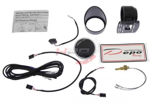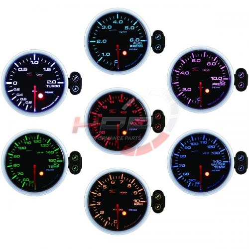 Budík nejvyšší série Peak firmy Depo Racing. Budíky mají programovatelné varování (programmable warning) a také funkci vyvolávání (peak recall). Budíky jsou podsvícené sedmi různými barvami pomocí LED diod (viz. foto). Lze tedy vybrat vhodnou kombinaci. Jsou výborně viditelné i při ostrém slunci. Montážní hloubka je 35mm. Balení obsahuje kabeláž, senzor tlaku, ovládací panel, stínítko, držák na palubovku a montážní materiál.
