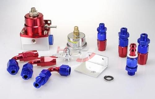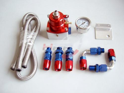 Univerzální benzinový regulátor tlaku paliva (profi kit) s manometrem (glycerinová náplň, ukazatel v PSI), pancéřovými hadicemi, fitinkami (AN6). Výstupy 1/8 NPT.