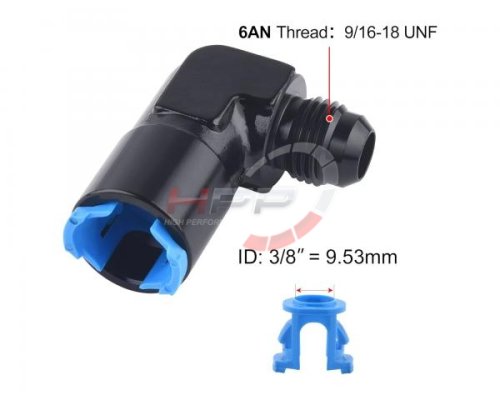Rychlo spojka koleno 90° na sériový EFI palivový systém D-06 (AN6) na 3/8" - samice (push-on). Závit: 9/16"x18-UNF.