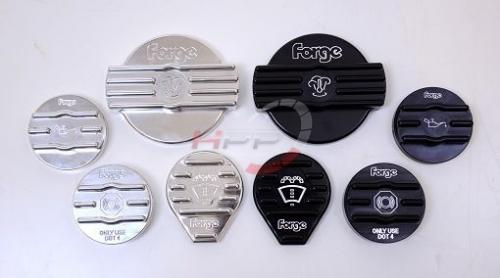 Set krytů víček na olej, vodu, brzdy, ostřikovače Forge Motorsport - černé/leštěný hliník. Pasují na většinu 2.0 TFSi motorů od roku 2014.