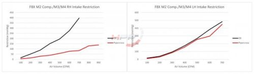 - Testováno průtokem pro potvrzení maximálního snížení omezení proudění vzduchu o 78,76 % v porovnání s plně pravým a levým originálním sacím systémem.