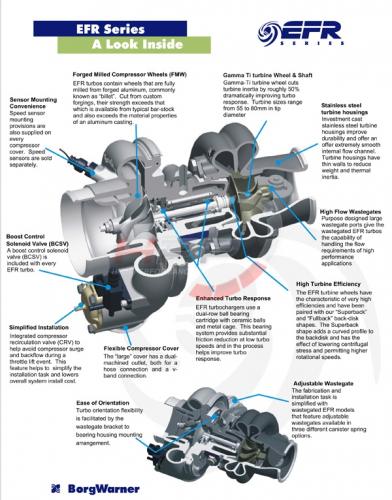 Turbodmychadla BorgWarner řady EFR jsou momentálně nejpokročilejší řada turbodmychadel na trhu. Světový gigant na poli výroby a vývoje turbodmychadel BorgWarner udělal v poslední době obrovský skok. Od základu navrhnul novou řadu turbodmychadel, do které vložil pouze ty nejmodernější technologie a postupy a dal tím vzniknout turbodmychadlům řady EFR. Ty se vyznačují nejmodernější aerodynamikou, extrémně lehkými keramickými ložisky, kovaným odlehčeným kompresorovým a Gamma-Ti výfukovým kolem, které mají taktéž extrémně nízkou váhu a setrvačnost. To vše završuje lehký obal odlitý z nerezu, jehož stěny jsou více jak o polovinu tenčí, než u konvenčních turbodmychadel s litinovou částí, což přispívá k nízké hmotnosti.