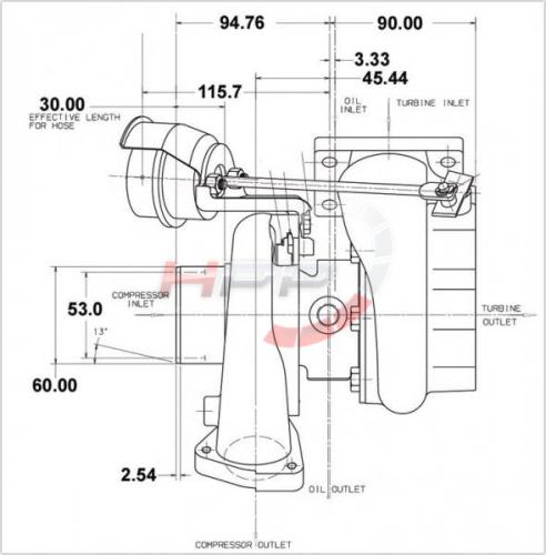 - kompresorová část = A/R 0.80 / Trim 60. Vnitřní/vnější průměr hřídele 42,1/54,3mm.