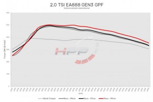 - Inovativní motor 2.0TSI umí být vcelku úsporný, ale když je potřeba, dodává velmi pěkný výkon v celém spektru otáček. Software Revo umožňuje těmto motorům dodatečný výkon a širší výkonové pásmo, aniž by ztrácel hladký chod nebo se zhoršila spotřeba. Zvýšení točivého momentu v celém rozsahu otáček poskytuje mnohem větší flexibilitu ve všech převodových stupních. Někteří zákazníci zaznamenali snížení spotřeby až o 10% po této úpravě.