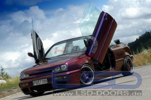 Kompletní systém vertikálního otevírání dveří LSD (Lambo Style Doors) pro VW Golf III typ 1E, rok výroby 09/91-, cabrio. Originální systém od německého výrobce KW Automotive. Jednoduchá montáž na originální úchyty pantů dveří bez nutnosti zásadních zásahů do karoserie vozu. Kompletní dodávka včetně montážního příslušenství. Bezpečný systém testovaný crash testy. Homologace TÜV.