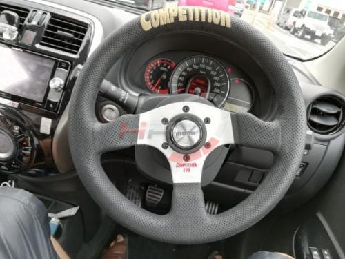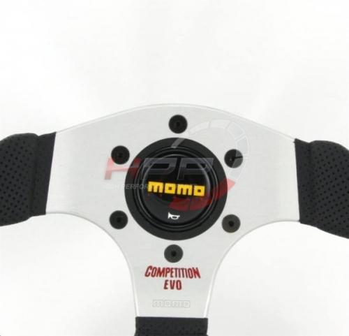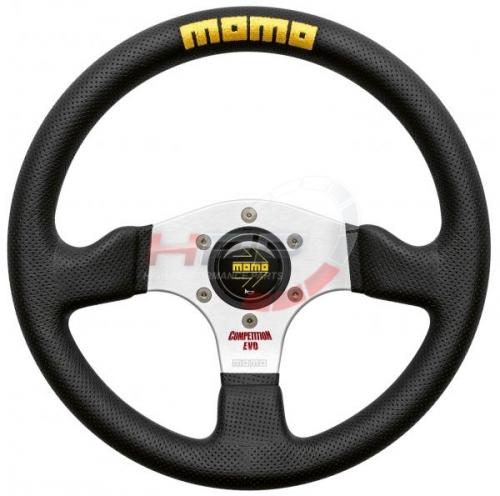 Sportovní kožený volant Momo model Competition Evo v klasickém designu, který disponuje koženým věncem, stříbrným středem, červeně frézovaným logem Momo pod klaksonem a výrazným logem momo na horní straně věnce.