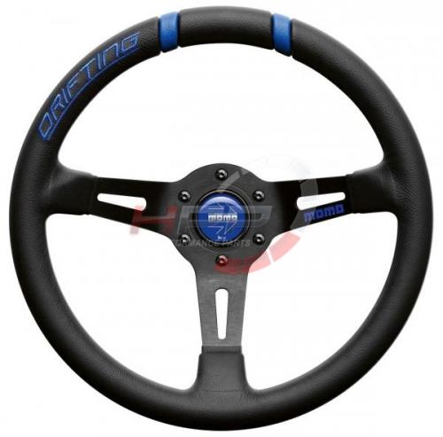 Sportovní tříramenný kožený volant Momo model Drifting inspirovaný designem závodních volantů, hlavně jejich tvarem, hlubokým odsazením a menším průměrem. Jeho ergonomie a velikost poskytuje dobré a přesně ovládání. Efektními prvky jsou modře vyšitý nápis Drifting na věnci, modré ukazatele přímého směru a modré logo Momo na paprsku volantu.