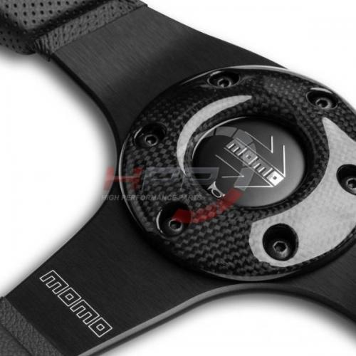 Sportovní tříramenný kožený volant Momo model Jet kombinuje perforovanou kůži v místě úchopů, hladkou kůži na spodní a horní straně věnce a karbonové doplňky v místě bicepsů a středu kolem klaksonu.