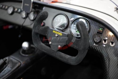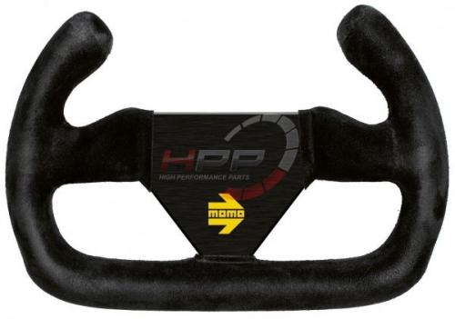 Závodní formulový semišový volant Momo model Modell 12C je kompaktní volant, jeden z nejmenších, s horním výřezem pro lepší viditelnost, ideální pro menší kokpit vozů Formule. Ploché dno usnadňuje nastupování a vystupování z vozidla a poskytuje větší prostor pro nohy. Eloxovaný střed.
