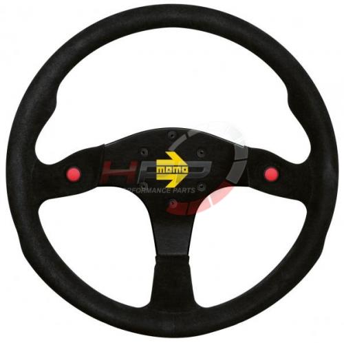 Závodní tříramenný semišový volant Momo model 80 zajišťuje díky jemným anatomickým prvkům pohodlné uchopení. Volant je vybaven dvěma klasickými tlačítky, která lze připojit k podpoře různých závodních systémů.