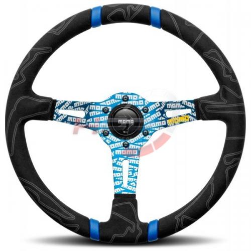 Sportovní semišový volant Momo model Ultra s průměrem 350mm a odsazením 90mm inspirovaný závodní tematikou. Semišový věnec zobrazuje nejznámější závodní tratě. Střed zaujme četným zobrazením loga Momo.