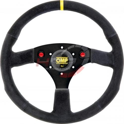 Závodní tříramenný semišový volant OMP model 320SP. Středící proužek ve žluté barvě, černě eloxované paprsky. Zvolené materiály zajišťují perfektní a přesnou práci s volantem. Efektivní prvek v podobě středové houkačky se žlutým logem OMP. Volant je také vybaven dvěma klasickými tlačítky, která lze připojit k podpoře různých závodních systémů.