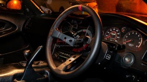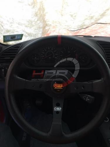 Závodní tříramenný kožený volant OMP model Corsica. Středící proužek v červené barvě, eloxované paprsky v černé barvě s vybráním. Věnec volantu je prošitý červenou nití. Dostatečné odsazení zajišťuje perfektní a přesnou práci s volantem. Efektivní prvky v podobě žlutého loga OMP na spodním paprsku a středové houkačky se žlutým logem OMP.