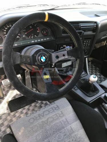 Závodní tříramenný semišový volant OMP model Corsica. Středící proužek ve žluté barvě, eloxované paprsky v černé barvě s vybráním. Věnec volantu je prošitý žlutou nití. Dostatečné odsazení zajišťuje perfektní a přesnou práci s volantem. Efektivní prvky v podobě žlutého loga OMP na spodním paprsku a středové houkačky se žlutým logem OMP.