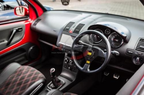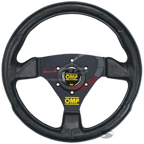 Sportovní tříramenný OMP s černým eloxovaným středem kombinuje věnec z polyuretanu, černé eloxované paprsky a perforaci v místě úchopů. Efektivní prvky v podobě žlutého loga OMP ve spodní části paprsku a žlutého loga ve středu v houkačce.