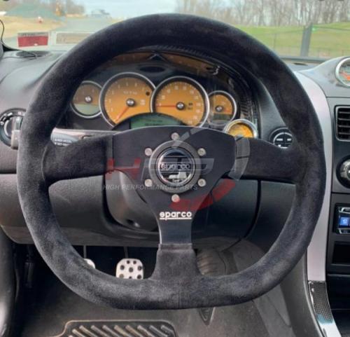 Sportovní tříramenný Sparco model Ring s černým středem kombinuje věnec z černé broušené kůže a efektivní prvky v podobě loga Sparco ve spodní části věnce a loga ve středu volantu v houkačce. Zvětšené bicepsy.