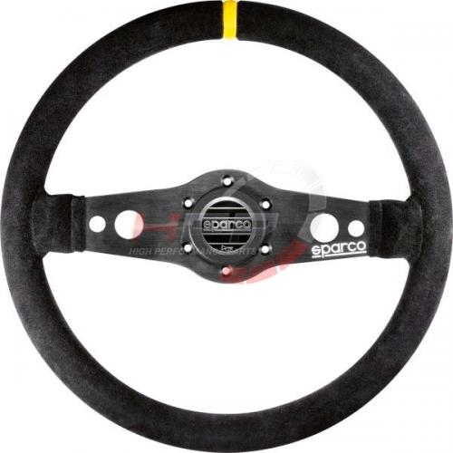 Závodní dvouramenný semišový volant Sparco model R215. Černé eloxované paprsky s vybráním. Věnec potažený kvalitní černou semiší zajišťuje perfektní a přesnou práci s volantem. Efektivní prvky v podobě loga Sparco na pravém paprsku a středové houkačky s logem. Středící proužek ve žluté barvě.