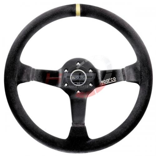 Závodní tříramenný semišový volant Sparco model R325. Černé eloxované paprsky. Věnec potažený kvalitní černou semiší zajišťuje perfektní a přesnou práci s volantem. Efektivní prvky v podobě loga Sparco na pravém paprsku a středové houkačky s logem. Středící proužek ve žluté barvě.