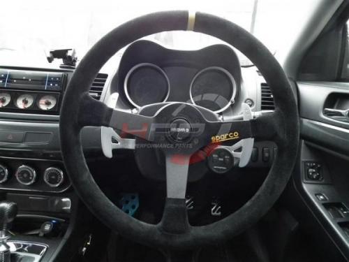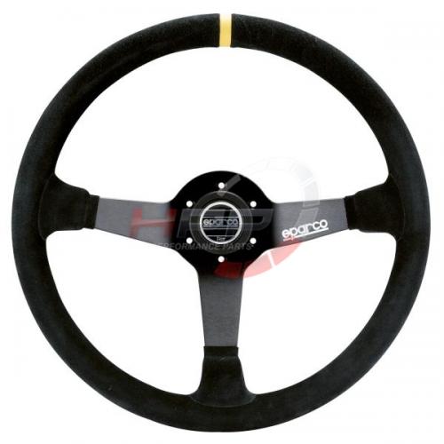 Závodní tříramenný semišový volant Sparco model R368 speciálně vyroben pro off road vozy. Černé eloxované paprsky. Věnec potažený kvalitní černou semiší zajišťuje perfektní a přesnou práci s volantem. Efektivní prvky v podobě loga Sparco na pravém paprsku a středové houkačky s logem.
