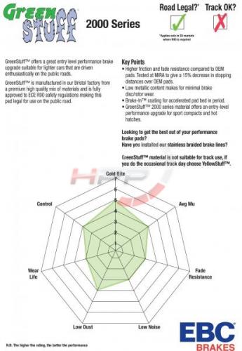 Brzdové destičky EBC Brakes řady Greenstuff jsou určené pro silniční použití, jak pro sériové, tak lehce upravené vozy. Jejich směs je navržena tak, aby fungovala již za studena a nabízela okmažitý brzdný účinek. Směs také neobsahuje agresivní černý brzdový prach, který se lepí na ráfky a ničí je. Posktyují perfektní stálý brzdný účinek do 650°C. Vyznačují se velmi dobrou životností i přes velký koeficient tření.