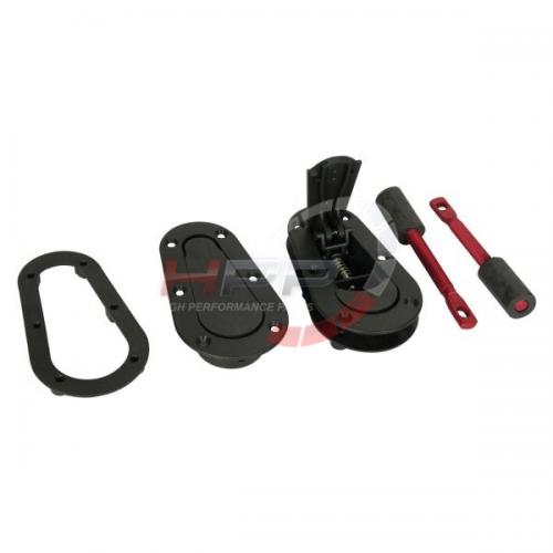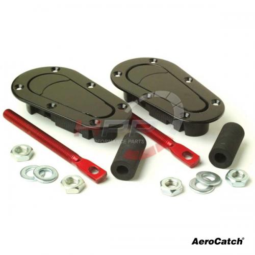 Zámky / držáky kapoty Aerocatch. Standardní zavírání. Montáž z vrchu kapoty. Barevné provedení: černé.