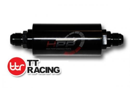 Benzínový filtr TT Racing univerzální D-08 (AN8). Hliníkový. Černě eloxovaný. Šroubovací koncovky D-08 (AN8).