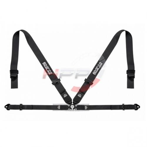 Závodní 4-bodový bezpečnostní pás Sparco. Ocelové nastavovače a hliníkové spony. Hliníková rozepínací spona.