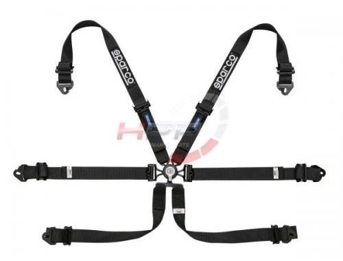 Závodní 6-bodový bezpečnostní pás Sparco. Hliníkové nastavovače a hliníkový zámek. Systém utahování Pull-Down. Povoleno pouze ve spojení se systémy FHR (včetně H.A.N.S.). Uchycení pro ochranný rám (ramena a stehna).
